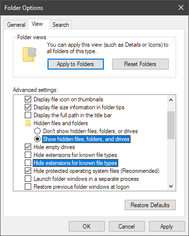 NOTE: You may have to enable “Show hidden files, folders, and drives”, and disable “Hide extensions for known file types” in Folder Options in order to navigate to Flawfinder’s installation path and change its extension, as shown below:
