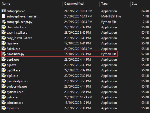 Navigate to the location in the output, and you will see the blank “flawfinder” file among possibly other Python files, however with no extension, as shown below: