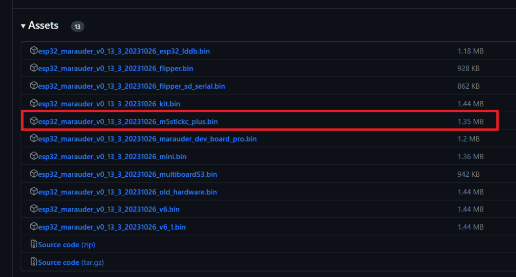 Head over to the ESP32 Marauder GitHub page, and download a Marauder release. The most stable release as of yet with specific regard to the M5StickC Plus is v0.13.3, but you could download the latest release at the time of reading this and see if that works well for you too.