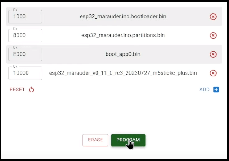 Then, in the 4 file upload fields that show up, pay attention to the “0x” numbers on the left, and refer to the table from step #1 to upload the respective files. Hit “PROGRAM” once you’ve uploaded all 4 files.